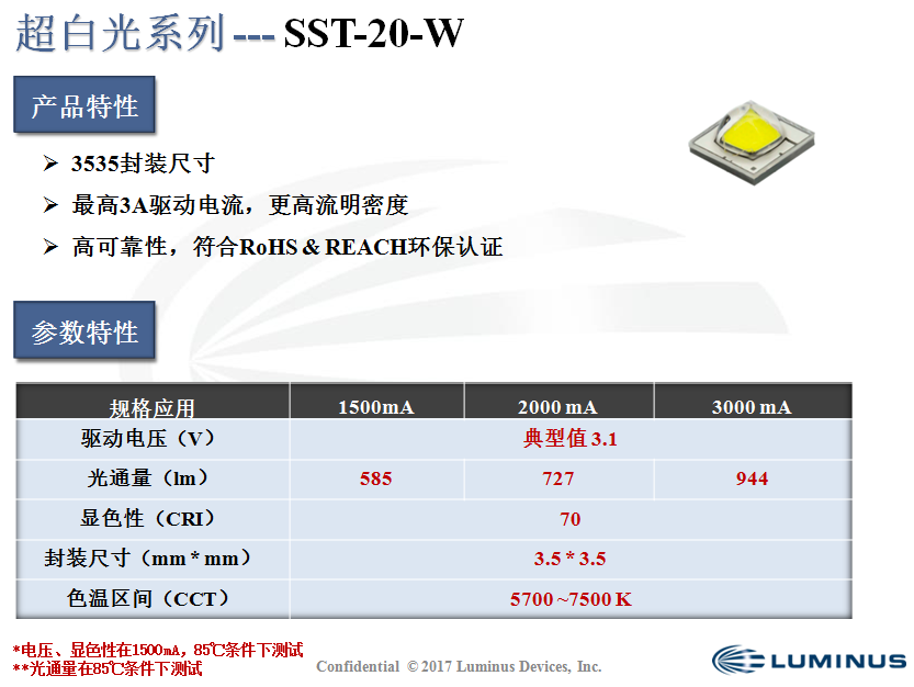 全新超高亮度白光,更高的流明密度9mm超小發光面,高達3A/mm的驅動能力三種可選應用:WDS(5700K)、WCS(6500K)、…